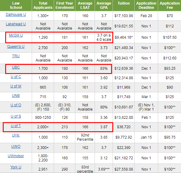 以下是北美法學教育綜合網(wǎng)站對加拿大幾所法學院的申請人數(shù),錄取人數(shù),法律學校入學考試成績平均分和GAP 平均分的統(tǒng)計。