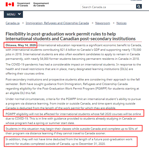 5月14日,加拿大聯(lián)邦移民部修改了留學生畢業(yè)工簽(PGWP)的內容,國際留學生在今年秋季學期,可以在國內上網(wǎng)課,之后返回加拿大完成整個課程后,仍有資格申請畢業(yè)工簽。