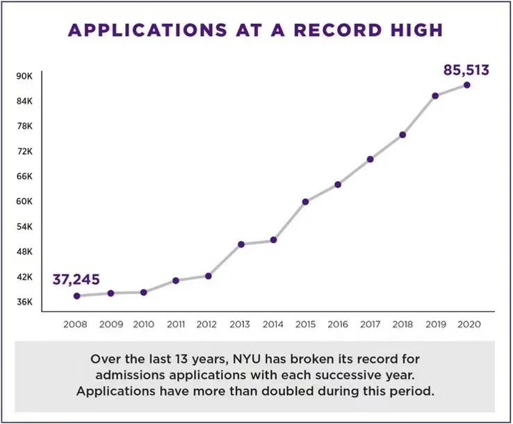 我們來看一下關(guān)于紐約大學(xué)(NYU)的招生情況。與往年相比,該院校的申請人數(shù)今年仍較去年增長。據(jù)官方統(tǒng)計,2008年該所院校一共擁有37,245名申請者;在已經(jīng)結(jié)束的2020年申請季里,其一共擁有85,513名申請人。