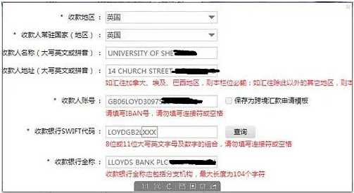 ? 辦理要求:提供收款人姓名、開戶行名稱、地址、賬號(hào)、SWIFT CODE 或 Routing No.,幣種須選擇英鎊。