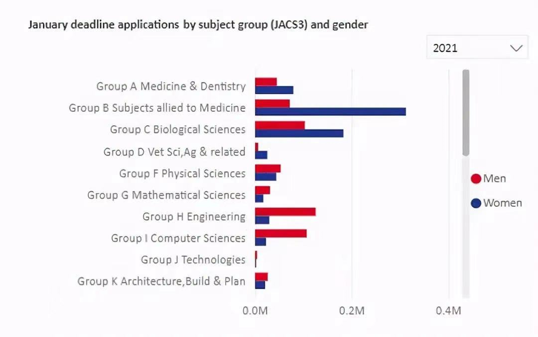 過去10年,在申請英國本科的中國大陸申請者中,女性一直多于男性。2021年,中國大陸女性申請人數(shù)為13560人,中國大陸男性申請人數(shù)為12260人。美國的情況類似。特別值得注意的是,2021年美國男性申請者僅比前一年增加250人,美國女性申請者比去年暴漲2270人,是今年美國申請英國大學(xué)人數(shù)大漲的主力軍。