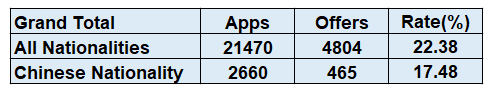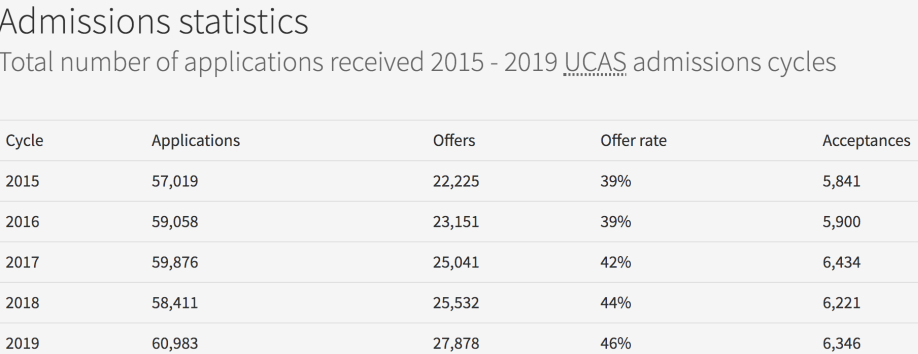 然而超強的實力也讓LSE的錄取門檻水漲船高,錄取率一年比一年低。在UCAS 2019/20 Session中,LSE共收到21470份申請,最終發(fā)出Offer 4804份,錄取率為22%;中國學生的申請有2660份,但Offer數(shù)只有465份,錄取率僅有17%,低于平均水平。