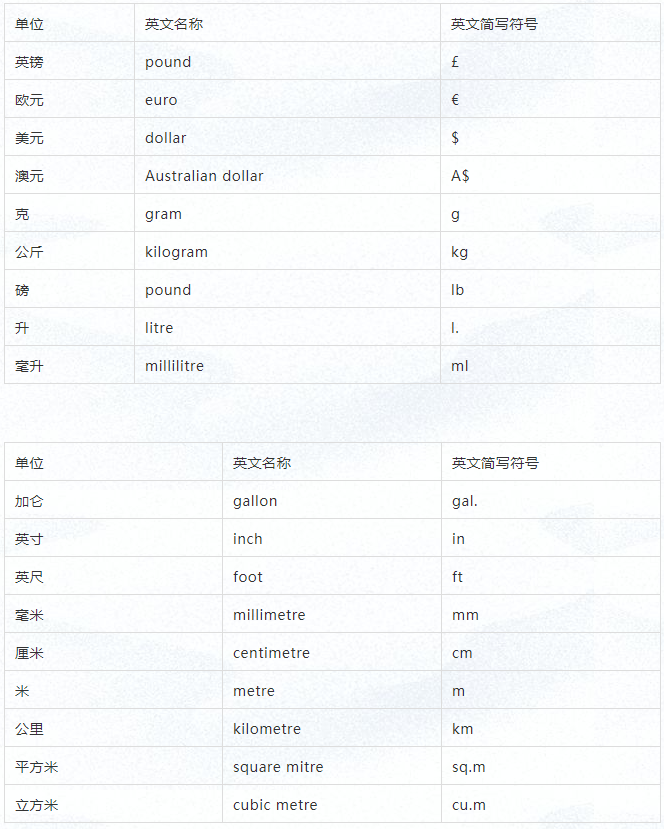 注意:英鎊符號(£)、美元符號($)、澳元符號(A$)和歐元符號(€)都寫在數(shù)字前,而pence“便士”寫在數(shù)字后;$10.50這類帶小數(shù)點的金額有三種讀法,特別要注意省略pounds的讀法ten fifty.
