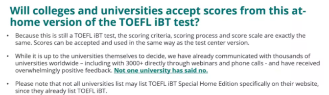 目前美國絕大多數(shù)院校是接受托福家考成績的,但是頂尖的高校往往比較傲嬌,所以也有那么幾所學(xué)校不愿意接受這類成績。