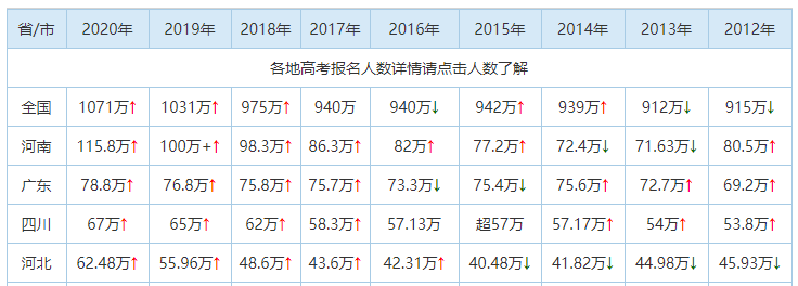 2020年全國高考報名人數(shù)高達(dá)1071萬,其中河南省高考報名人數(shù)115.8萬,在全國各省份中排名第一位。