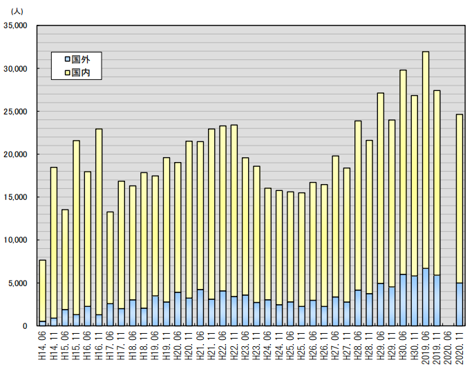 留學(xué)生在日本是單獨(dú)考試,不和日本本國學(xué)生競爭。根據(jù)日本學(xué)生支援機(jī)構(gòu)JASSO的數(shù)據(jù)統(tǒng)計,2020年11月留學(xué)生考試人數(shù)為24,634人,2021年6月報名人數(shù)下降至22,332人,近幾年基本都維持在2.5萬人左右。