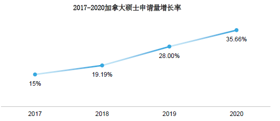 碩士的申請(qǐng)量也在持續(xù)攀升,且增速在逐漸加快,甚至上升的速率比本科更快。2020年入學(xué)季,加拿大碩士申請(qǐng)量增長(zhǎng)達(dá)到35.66%,較2017年的增速翻倍且不止。