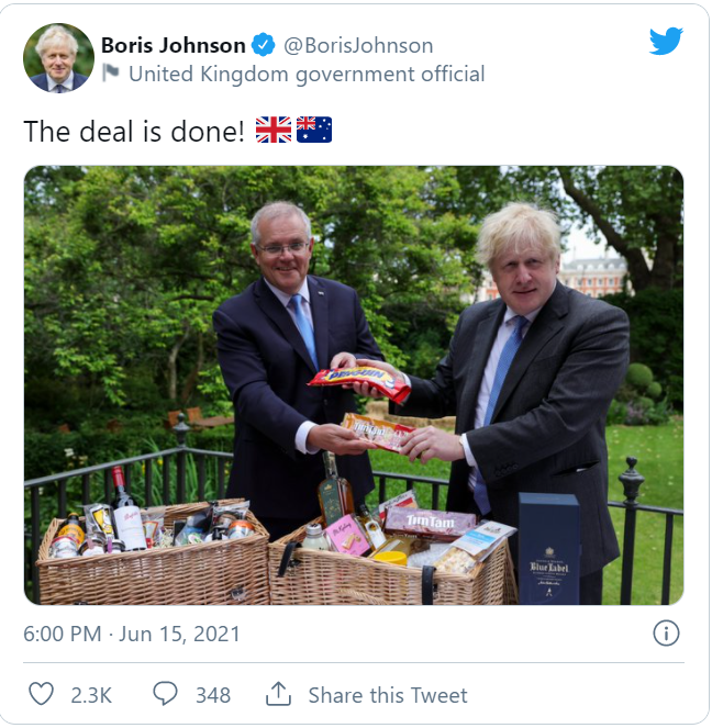 澳洲東部時間周二晚,澳洲總理莫里森和英國首相約翰遜召開聯(lián)合媒體發(fā)布會,宣布澳英達成原則性自貿(mào)協(xié)定。