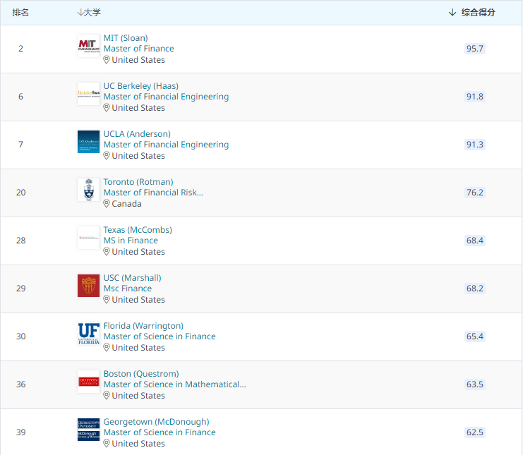 金融工程碩士:卡耐基梅隆大學、康奈爾大學、紐約大學、羅格斯大學、斯坦福大學、加州大學伯克利分校;