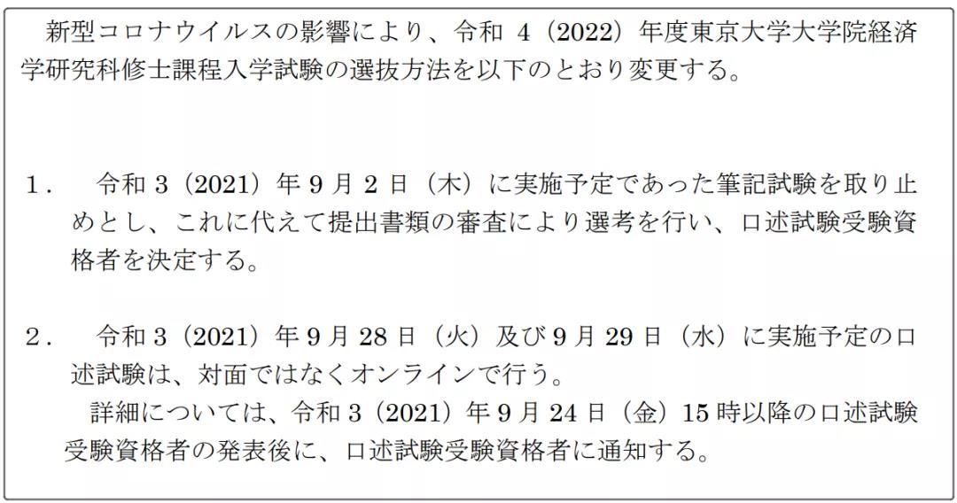 由于疫情影響,也有學(xué)校取消了校內(nèi)考筆試。比如東大經(jīng)濟(jì)學(xué)研究科: