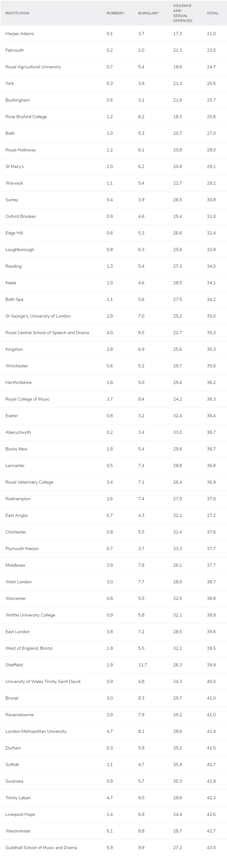 英國(guó)及威爾士128所大學(xué)中,周邊地區(qū)安全性最好的50名大學(xué)如下: