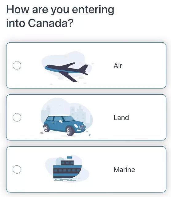 完成注冊(cè)后登錄賬號(hào),選擇入境加拿大的方式(乘飛機(jī)入境、路陸入境、海路入境)↓