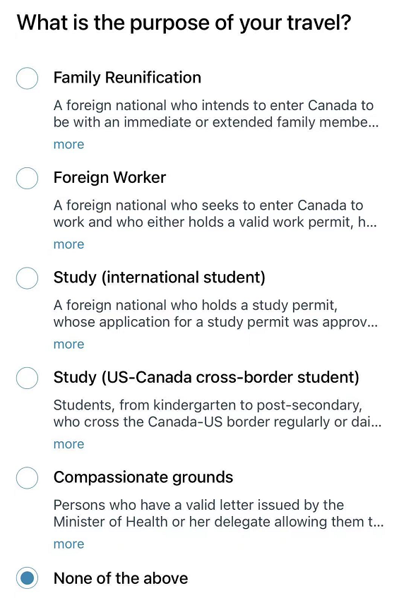 留學(xué)生/工簽/家庭團(tuán)聚/美加學(xué)生/人道主義考慮(在加親友病重、病危、奔喪者)/加拿大公民或PR,選NO(加拿大護(hù)照或楓葉卡選擇None of Above)↓