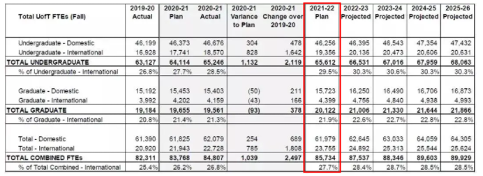 據(jù)多倫多大學(xué)官網(wǎng)數(shù)據(jù)顯示,2021-2022年本科和碩士國際學(xué)生的比例預(yù)計(jì)都將比去年有所增加,申請本科的國際生占29.5%,申請碩士的國際生占21.9%。