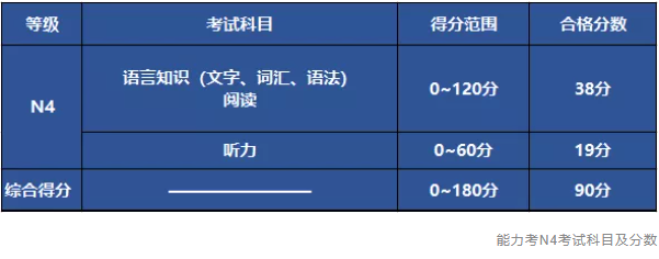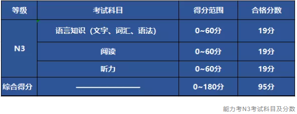 N1考試包括語言知識、閱讀、聽力,滿分180分,合格分數(shù)為100分、每科目至少達到19分以上即發(fā)給日語N1證書。