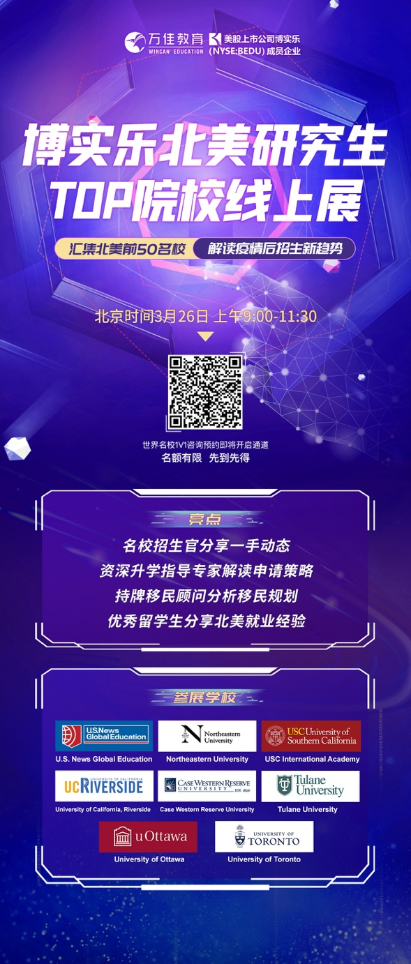 這一系列問題,將會在3月26日的研究生展會上獲得答案。不僅有國際升學(xué)專家助您明晰方向,還會有多所北美名校招生官帶來第一手權(quán)威政策解讀。2022線上研究生展會,博實樂萬佳精選7所北美名校,讓您“足不出戶,云端全知道”,助您求學(xué)之路,收獲滿滿!