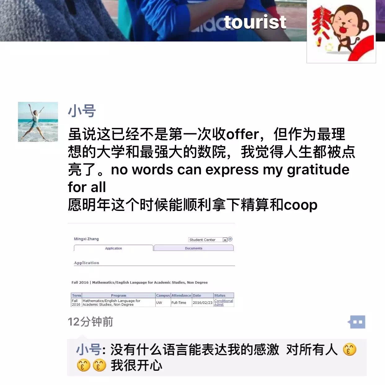 在申請過程中,學(xué)生在滑大的另一個專業(yè)還被拒錄了,讓我們小小的擔(dān)心了一下,經(jīng)過與學(xué)校溝通,確認(rèn)不會影響到學(xué)生數(shù)學(xué)系錄取,我們的心才算放下來。 今年2月,就在學(xué)生18歲生日的前一天, 學(xué)生收到了最好的成人禮物-滑鐵盧大學(xué)的Offer 和3000加幣入學(xué)獎學(xué)金, 終于夢想成真是學(xué)生也是我們最幸福的時刻!