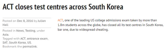 考試中心的關(guān)閉標(biāo)志著ACT考試在韓國(guó)的熱情消退。早在今年6月,ACT考試中心就曾取消了韓國(guó)和香港的考試成績(jī),涉及大概5500名考生。