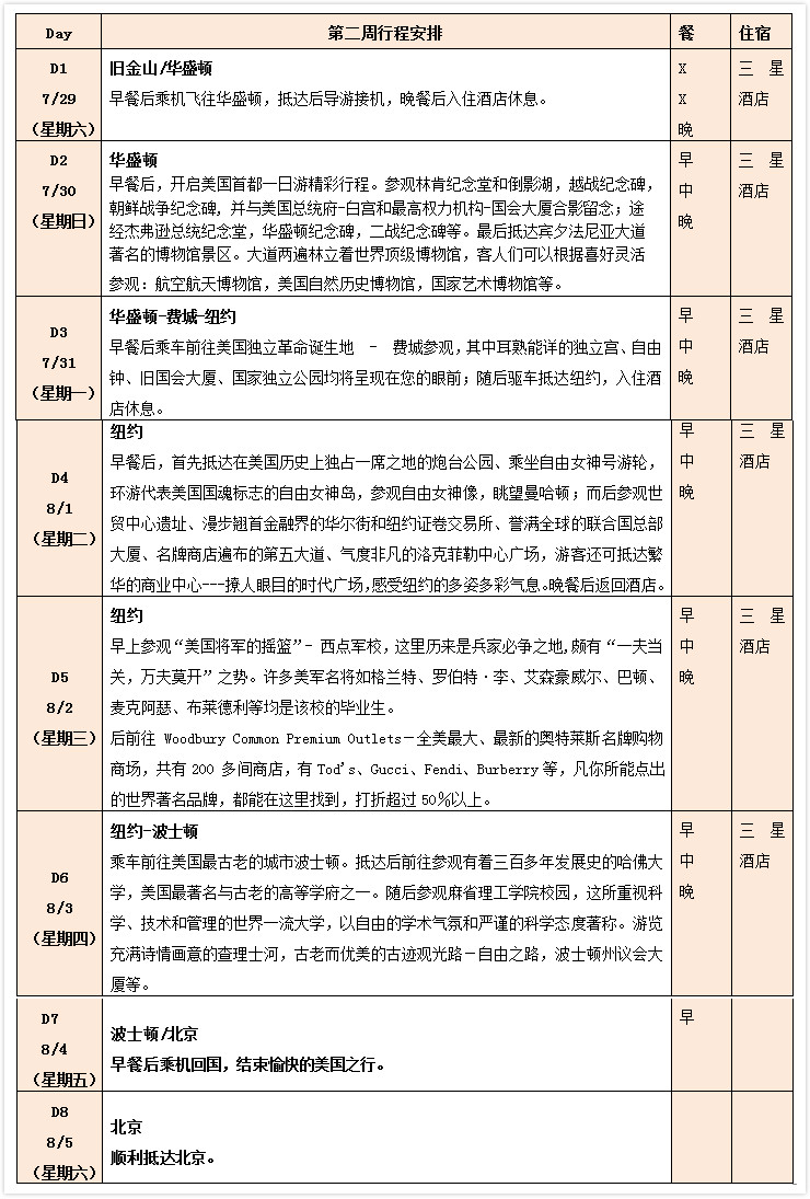 4. 周末安排全天的戶外活動(dòng),探索當(dāng)?shù)匚幕?br />5. 項(xiàng)目包含一周的美國(guó)東海岸參觀游玩,涵蓋美國(guó)頂尖大學(xué)和主要景點(diǎn);
