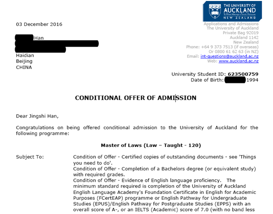 姓名:韓同學學歷:國內211院校大四在讀就讀專業(yè):法律語言成績:雅思(無)平均成績:80分申請院校:新西蘭奧克蘭大學申請專業(yè):Master of Laws(法律碩士)錄取院校:新西蘭奧克蘭大學備注:法律專業(yè)向來對于國際生很難申請,對于學生雅思的要求很高,好在學生院校背景不錯,經過一系列的定校和篩選,最終學生如愿拿到奧克蘭大學申的offer,現在正在積極準備雅思,希望能順利升讀,完成學生的名校夢!