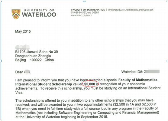 因?yàn)榧乃脱潘汲煽冞€需要時間,我們很快速的與各學(xué)校積極聯(lián)系,為郝同學(xué)爭取到了學(xué)校的錄取,隨著一個個學(xué)校錄取的到來,郝同學(xué)和爸爸媽媽真的是興奮不已。本來已經(jīng)選定了滑鐵盧數(shù)學(xué)院帶有7000加幣的獎學(xué)金,,但是多倫多大學(xué)的錄取收到后,她放棄了滑鐵盧7000加幣獎學(xué)金,UBC8000加幣獎學(xué)金和西安大略的錄取,最終選定了多倫多大學(xué),當(dāng)然多倫多大學(xué)也是帶獎學(xué)金的,6000加幣。