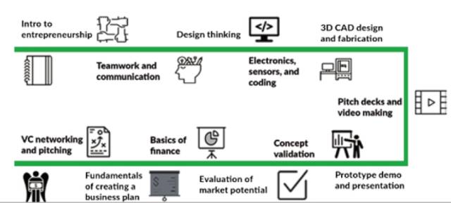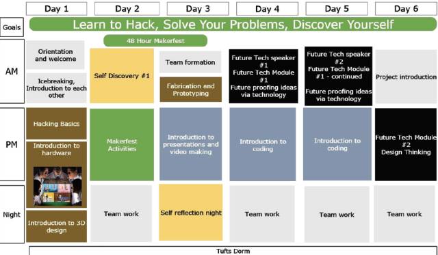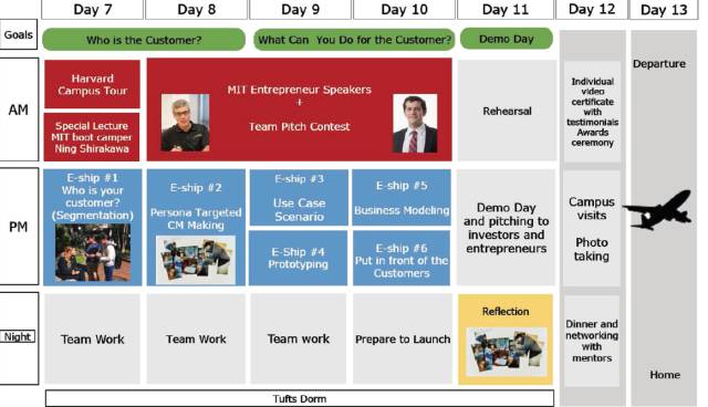 為期十二天的課程以MIT創(chuàng)業(yè)課程為框架。授課主要在哈佛大學(xué)和MIT完成。首先,參與者將會形成多樣的團(tuán)隊(duì),使他們能夠產(chǎn)生完備的、并且可行的商業(yè)想法。為了引進(jìn)STEM教育和編程,將會使用一個專有的使學(xué)習(xí)編程更加直觀的AI控制編程平臺。最好的學(xué)習(xí)是在形成聯(lián)系中產(chǎn)生的。課程與大學(xué)參觀相結(jié)合,使參與者們能夠與MIT、哈佛大學(xué)和塔夫茨大學(xué)的學(xué)生與教授互動。各行業(yè)的專家和導(dǎo)師們也會在夏令營中輔助培養(yǎng)參與者們。