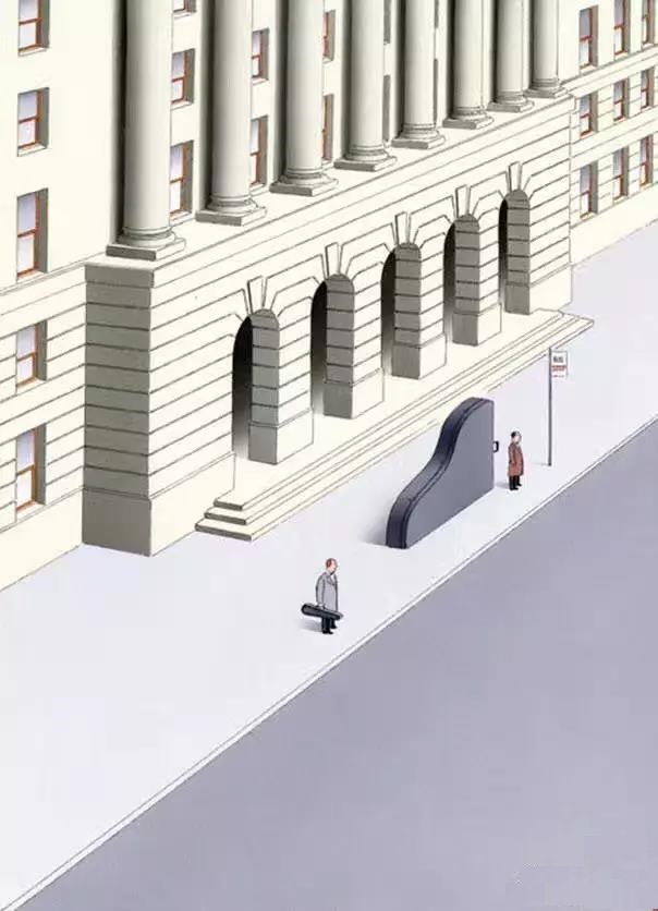 Guy Billout,法國藝術(shù)家、插畫師,出生于1941年,曾在廣告業(yè)工作一段時(shí)間,1969年移居紐約并開始為一些雜志社工作,客戶包括《紐約時(shí)報(bào)》、《紐約客》等,畫面風(fēng)格干凈簡潔,常融合一些諷刺元素, 藝術(shù)家官方網(wǎng)站:http://www.guybillout.com/。
