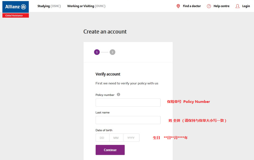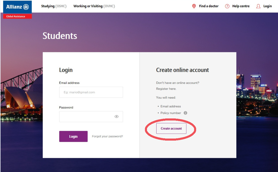 03 點(diǎn)擊Create account, 如下圖所示;這一步的快捷鏈接如下:https://allianzassistancehealth.com.au/en/auth/