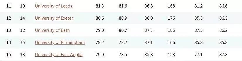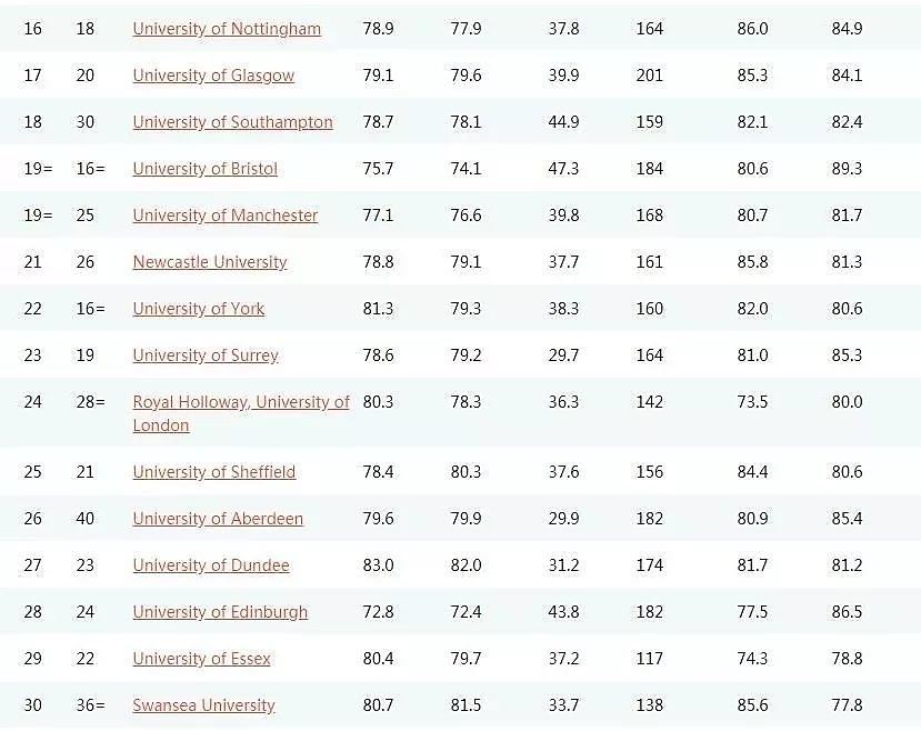 10-20名與去年相比變動(dòng)不大,各個(gè)大學(xué)幾乎在小區(qū)間內(nèi)微微浮動(dòng)。變動(dòng)明顯的是南安和曼大。南安今年名次上漲12位,超過了曼大,終于回歸前20。綜合實(shí)力不容小覷。曼大實(shí)至名歸的進(jìn)入了前20。原本位列40,在醫(yī)學(xué)界享有盛譽(yù)的阿伯丁升至26,有工程師搖籃之稱的斯旺西喜提前30。有喜就有悲,約克和薩里意料之外的跌出前20。