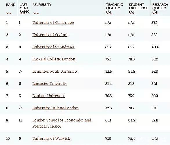 去年十強(qiáng)與今年十強(qiáng)對(duì)比劍橋,牛津,圣安和帝國理工的前四位置屹立不倒。杜倫大學(xué)如今跌出前5,而拉夫堡大學(xué)乘著去年的東風(fēng),一舉拿下第五的獎(jiǎng)杯。蘭卡斯特大學(xué)穩(wěn)贏第6,而倫敦政經(jīng)將利茲擠下前十的寶座。