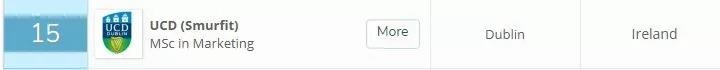 根據(jù)英國(guó)《金融時(shí)報(bào)》2018年九月發(fā)布的全球管理碩士(MiM)排名,UCD Michael Smurfit商學(xué)院的全日制國(guó)際管理碩士在全球排名第7。另外,Michael Smurfit商學(xué)院有兩門學(xué)位課程在2018年《金融時(shí)報(bào)》全球排名中躋身前50—— 金融碩士課程(第36位)和Smurfit高管發(fā)展公開招生課程(第48位)。除此之外,學(xué)院目前在歐洲商學(xué)院排行榜中排名第24位。