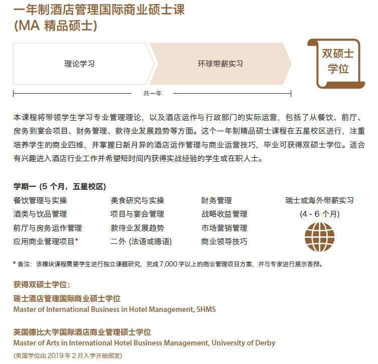 隨著全球第三產(chǎn)業(yè)的高速發(fā)展,款待業(yè)對(duì)高素質(zhì)的款待業(yè)管理人才的需求也日益增長(zhǎng),有見及此,自2017年起,瑞士酒店管理大學(xué)(SHMS)開設(shè)了一年制酒店管理國(guó)際商業(yè)碩士精品課程,為世界各地的酒店、旅游、會(huì)展、航空、奢侈品等企業(yè)輸送更多人才。該課程隨即受到世界各國(guó)學(xué)生的關(guān)注和青睞,受到了畢業(yè)校友的一致好評(píng)!為了提供更好的酒店管理教育并有效提升學(xué)生的就業(yè)競(jìng)爭(zhēng)力和學(xué)習(xí)體驗(yàn),SHMS為廣大學(xué)子送上2019年第一份新年禮物:一年制酒店管理國(guó)際商業(yè)碩士精品課程2.0,力求打造更高質(zhì)量的酒店管理碩士課程!