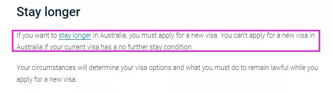 在澳洲當(dāng)?shù)剡M(jìn)行續(xù)簽的好處是,新的簽證申請(qǐng)一旦提交,移民局會(huì)自動(dòng)先發(fā)放一個(gè)Bridging Visa,也叫過橋簽。該過橋簽可以允許學(xué)生在當(dāng)前簽證失效之后合法待在澳洲境內(nèi),但期間不能離境,否則Bridging Visa自動(dòng)失效。你可能會(huì)留意到上面的截圖里有一個(gè)信息是you can’t apply for a new visa in Australia if your current visa has a no further stay condition,也就是說,如果你的簽證條款里有No further stay(即8534條款),那么就代表你不能在澳洲當(dāng)?shù)剡M(jìn)行簽證續(xù)簽,而是必須離開澳大利亞了之后才能遞交一個(gè)新的簽證申請(qǐng),這個(gè)信息也很重要哦!
