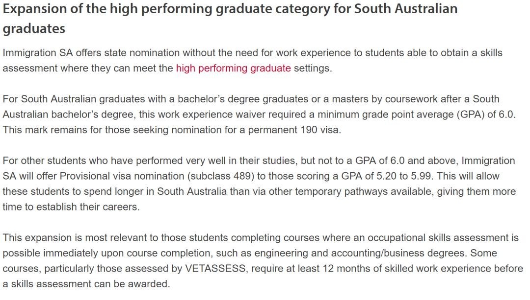 ◆ 南澳本科或者南澳本科碩士連讀畢業(yè)生的GPA達(dá)到6.0,在申請(qǐng)190永久簽證提名時(shí)可以獲得工作經(jīng)驗(yàn)豁免。這條是現(xiàn)行政策,沒(méi)有變動(dòng)。