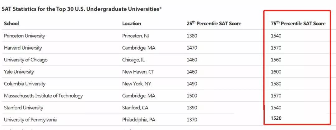 針對(duì)2018年TOP 30名校錄取的學(xué)生SAT分?jǐn)?shù)數(shù)據(jù)顯示,哈佛大學(xué)SAT需要達(dá)到1570、芝加哥大學(xué)需要1560、MIT需要1570,才會(huì)有相對(duì)競爭力。