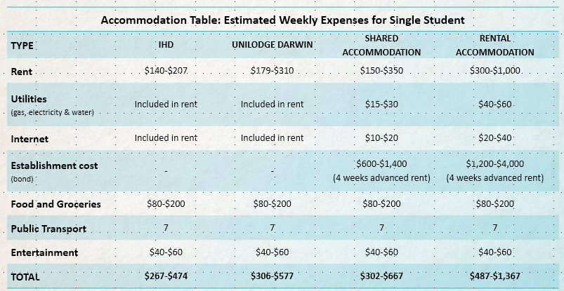 校內(nèi)住宿(Casuarina),最低140澳幣(含水電燃氣);外面公寓Unilodge Darwin,距離Casurina主校區(qū)步行距離10分鐘,費用從179多到310刀不等。公交費可辦理周卡7刀。因此,生活費一年開支在1.5-1.8萬左右。