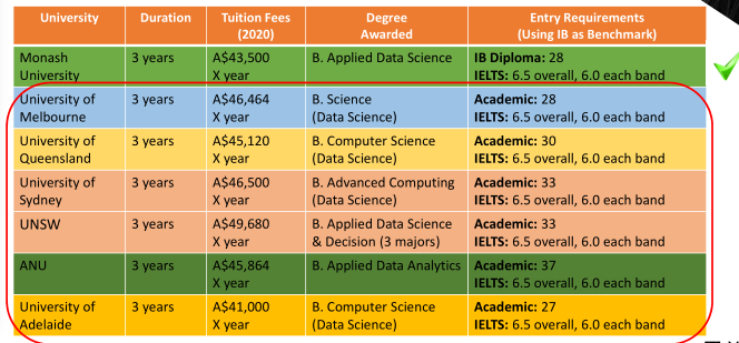 下圖是澳洲八大里開設(shè)數(shù)據(jù)科學(xué)相關(guān)課程的對比圖,從圖中可知,澳洲八大只有澳國立大學(xué)和蒙納士大學(xué)有開設(shè)專門的應(yīng)用數(shù)據(jù)科學(xué)學(xué)士課程,而國立大學(xué)的要求讓人瞠目且學(xué)費昂貴;其他大學(xué)則沒有專門的應(yīng)用數(shù)據(jù)科學(xué)學(xué)士,只是在計算機科學(xué)學(xué)士或信息技術(shù)學(xué)士課程提供數(shù)據(jù)科學(xué)專業(yè)方向,給學(xué)生在數(shù)據(jù)科學(xué)方面的學(xué)習(xí)廣度和深度方面比較有限。