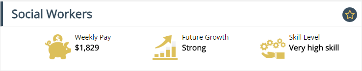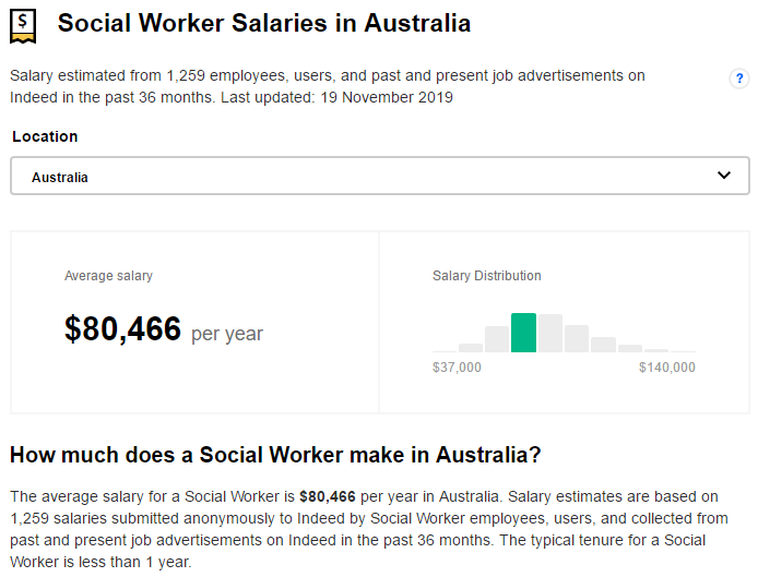 目前在澳洲,社會工作者的平均每周薪資為1, 829澳幣(數(shù)據(jù)來源于https://www.joboutlook.gov.au/),高于會計師、廣告/市場專員、會展組織、牙醫(yī)助理、幼兒教師等。另外,根據(jù)澳大利亞著名求職網(wǎng)站(https://au.indeed.com/)顯示,社會工作者的年薪平均為80, 466澳幣。怎么樣?這個收入水平是不是比童鞋們想象的要多呢?