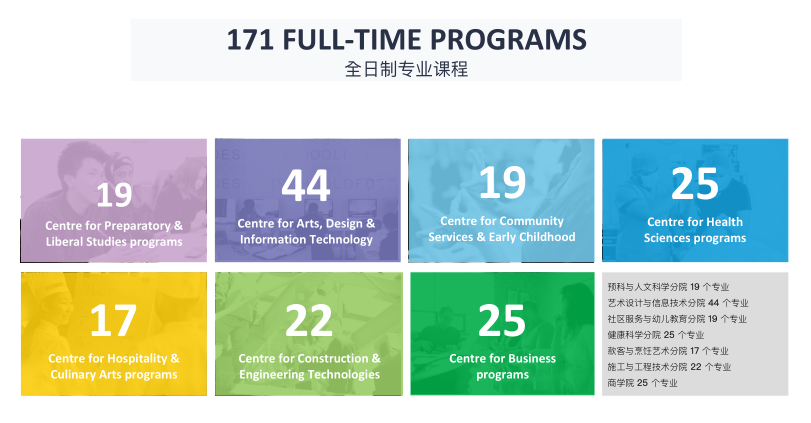 全日制學科涵蓋廣泛領(lǐng)域,主要包括烹飪藝術(shù)、款客與旅游管理、工商與金融、市場營銷、時裝與珠寶、平面設(shè)計、信息技術(shù)、表演藝術(shù)、建筑技術(shù)、機械工程、健康科學、社區(qū)服務(wù)、幼兒教育和普通文理。