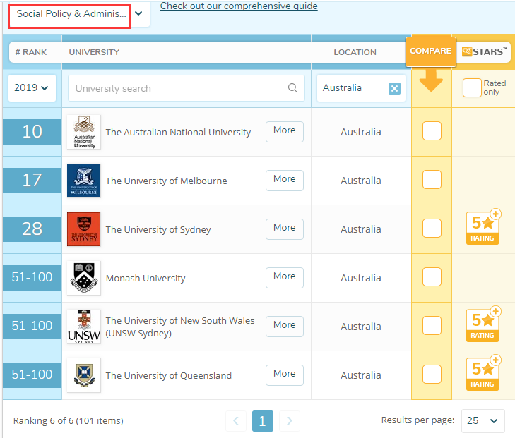 澳洲的教育一直致力于前沿學術研究和基礎教育并行, 從上方2019年QS世界大學排名 - 社會政策與管理學科排名 可以看出,澳洲大學在這方面的研究處于世界領先地位,大部分的八大學校該學科排名世界前百。