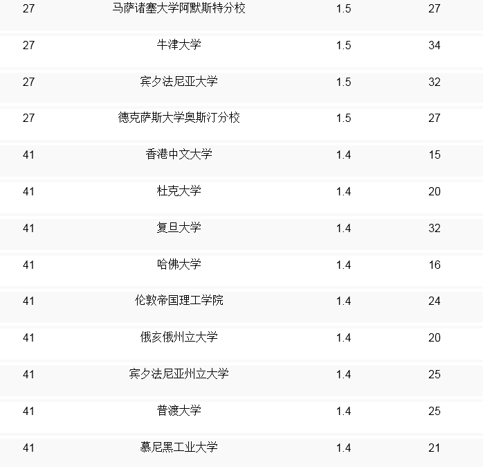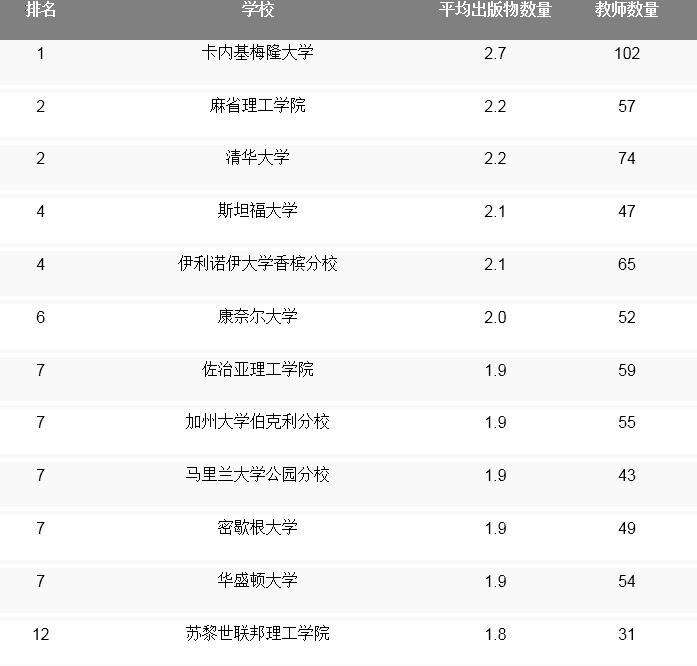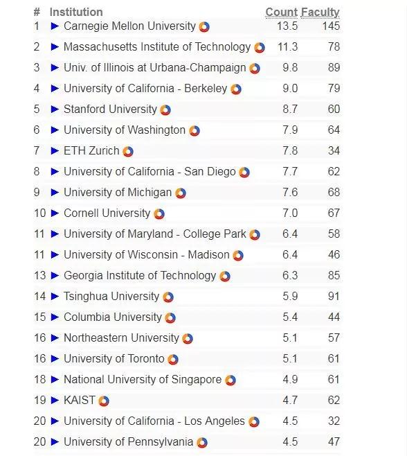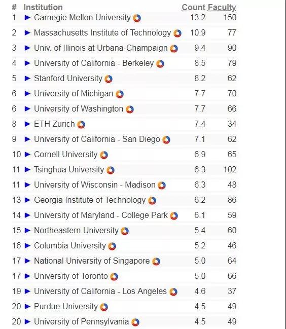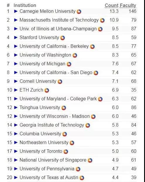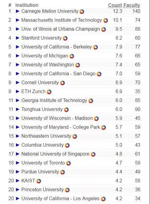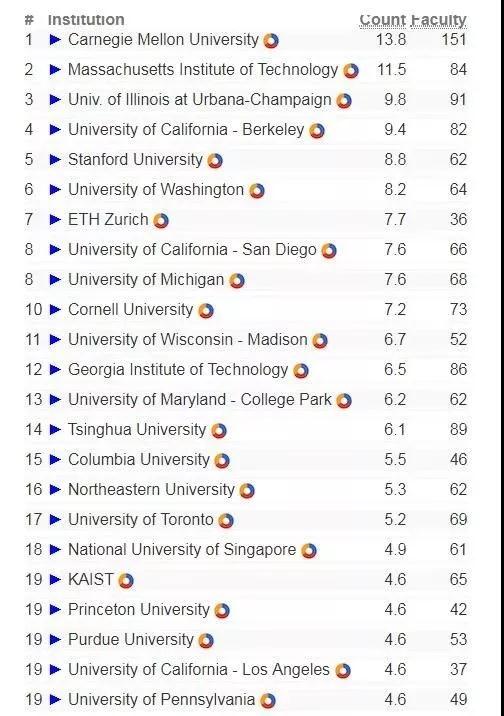 其他排進(jìn)前十的學(xué)校還包括斯坦福大學(xué)、伊利諾伊大學(xué)香檳分校、康奈爾大學(xué)、佐治亞理工學(xué)院、加州伯克利、馬里蘭大學(xué)公園分校、密歇根大學(xué)
