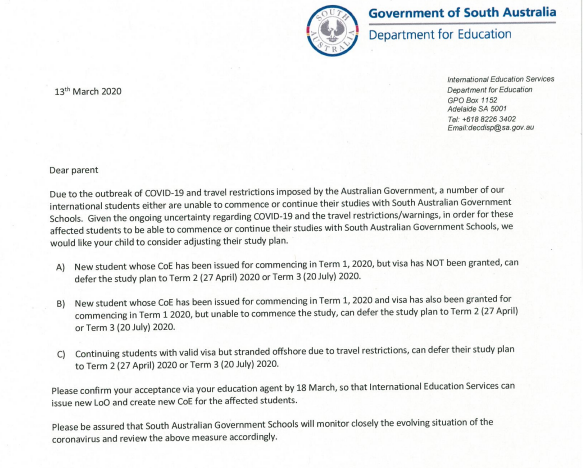 南澳政府中學(xué),提醒新生和在讀生,如果你受疫情的影響,沒有趕上Term1的開學(xué),可以將課程延期到Term2(4月27日)或Term3(7月20日)開學(xué)。