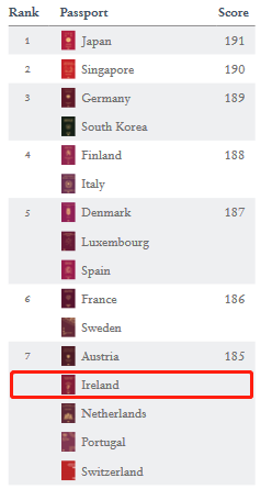 同時,根據(jù)“Henley & Partners”咨詢公司1月7日發(fā)布的《2020年亨利護(hù)照指數(shù)排名》,愛爾蘭憑借185個免簽國家和地區(qū)排名第七,超過了美國和英國,已被評為全球最強(qiáng)護(hù)照之一。