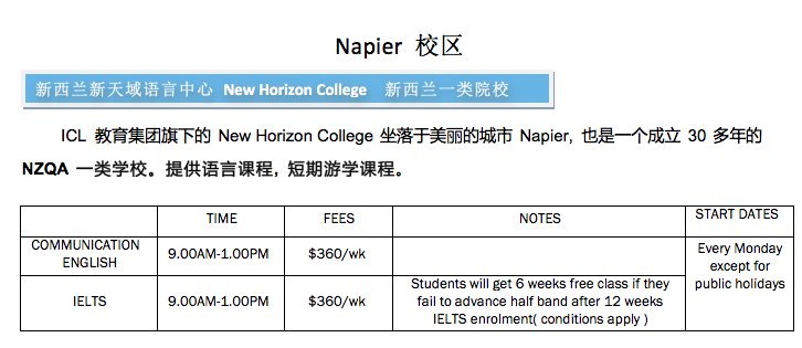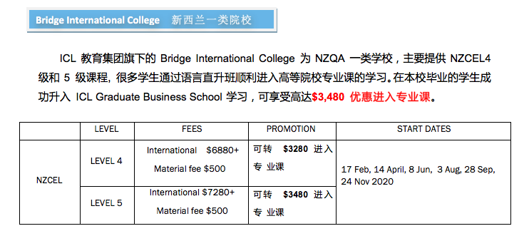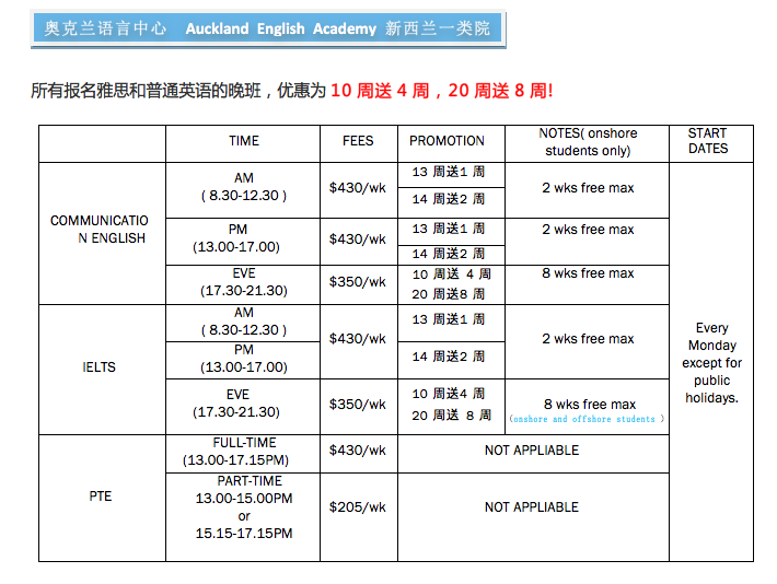 新西蘭ICL教育集團旗下所有的學校全部被NZQA(新西蘭教育部)評為一類院校,奧克蘭三大TOEFL考點之一,曾為IELTS分考點之一,新西蘭English New Zealand推薦國際學生就讀新西蘭語言學校之一,協(xié)助學生更好的,更快達到自己的目標,讓英語成為你的一大亮點。同時提供:新西蘭國家英語課程NZCEL4級和NZCEL5級的課程,PTE預備課程,并可內(nèi)測進入哦!另有語言優(yōu)惠政策:奧克蘭校區(qū):普通英語課程和雅思課程晚班10周送4周,20周送8周,350一周。各語言課程優(yōu)惠政策如下。