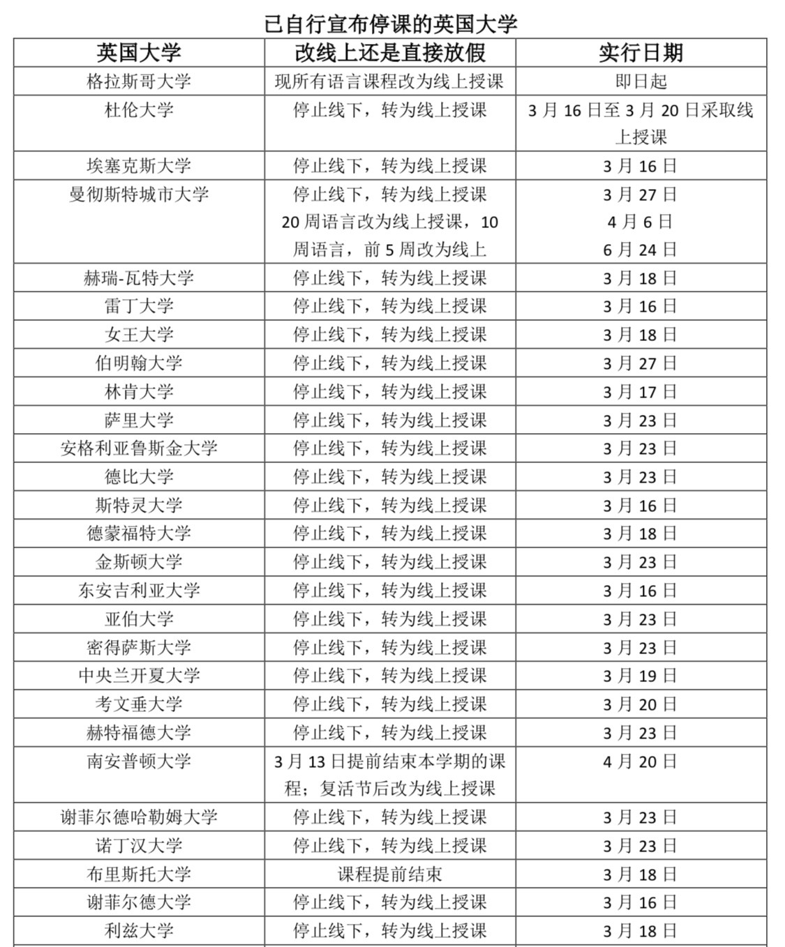 雖然鮑里斯在講話中沒有明確表態(tài)關(guān)閉學(xué)校,但英國高校是有權(quán)力自主決定是否停課或者改上網(wǎng)課的。目前,大部分英國大學(xué)已經(jīng)開始有所行動(dòng),以下列表中為英國部分院校信息匯總,如果大家所就讀的院校不在此列表中,大家也可以直接查詢學(xué)校官網(wǎng),獲得最新信息。