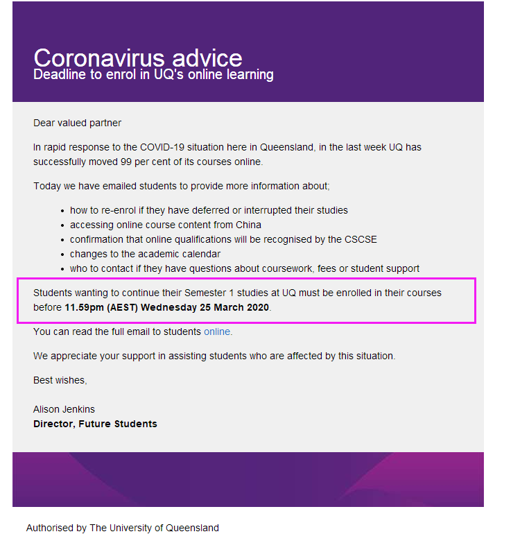 學校已經給學生發(fā)送郵件通知,郵件包含如何操作重新注冊/休學、如何操作線上課程等信息。如學生希望在線學習Semester 1的課程,請學生于3月25日(也就是今天)澳洲東部時間晚11點59分前在線注冊選課!之前已經延期過的學生,也可以選擇讀Semester 1的線上課程!