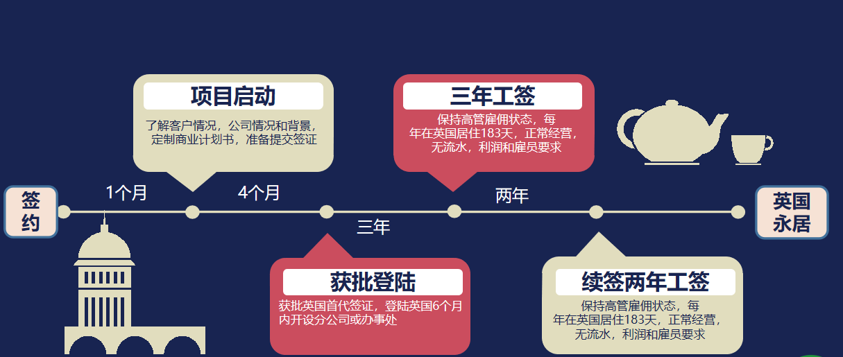 英國境外公司,可派遣一名高級管理人員前往英國,設(shè)立代表處或全資子公司。此高管將成為英國分支機構(gòu)的首席代表,獲得三年工作簽證,配偶及18歲以下子女可一同前往英國,子女享受英國教育,全家享受英國居民的福利和待遇。在三年工簽到期后可續(xù)簽兩年簽證,一共五年后,滿足一年不少于183天的居住要求后,可以申請英國永居。