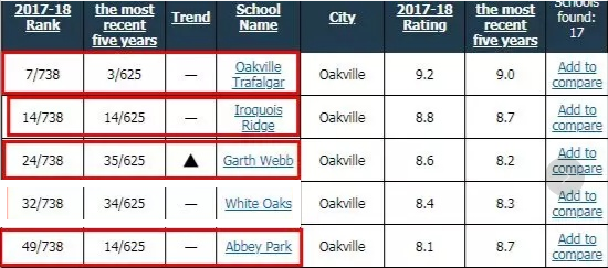 哈爾頓教育局排名安省前五十且尚有名額的學校