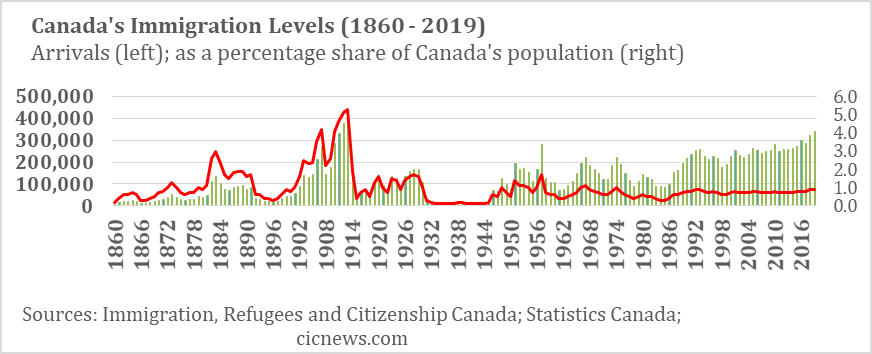 從歷史上來看,加拿大目前的移民水平是很高的。自1867年建國以來,只有五次年接納新移民超過了30萬;按照人口水平來看,目前的移民水平就更高了,因為現(xiàn)在每年接納的新移民占其人口的0.9%。相比之下,美國最近每年平均接待一百萬名移民,但是這一數(shù)字僅占其人口的0.3%。
