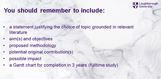 英國的博士基本申請材料和研究生大致相同,學(xué)位證和畢業(yè)證,成績單,個(gè)人陳述,簡歷,兩封推薦信,還有語言成績。除了這些,博士申請?zhí)赜械?,也是最重要的就是研究?bào)告了。研究報(bào)告是體現(xiàn)你對即將要在博士階段研究課題的想法介紹,是給博士導(dǎo)師的最初印象。是顯示你研究的能力和潛力,也是錄取的關(guān)鍵因素。下面我們來看下全英前10的大學(xué)拉夫堡大學(xué)對于申請博士的研究報(bào)告的小建議: